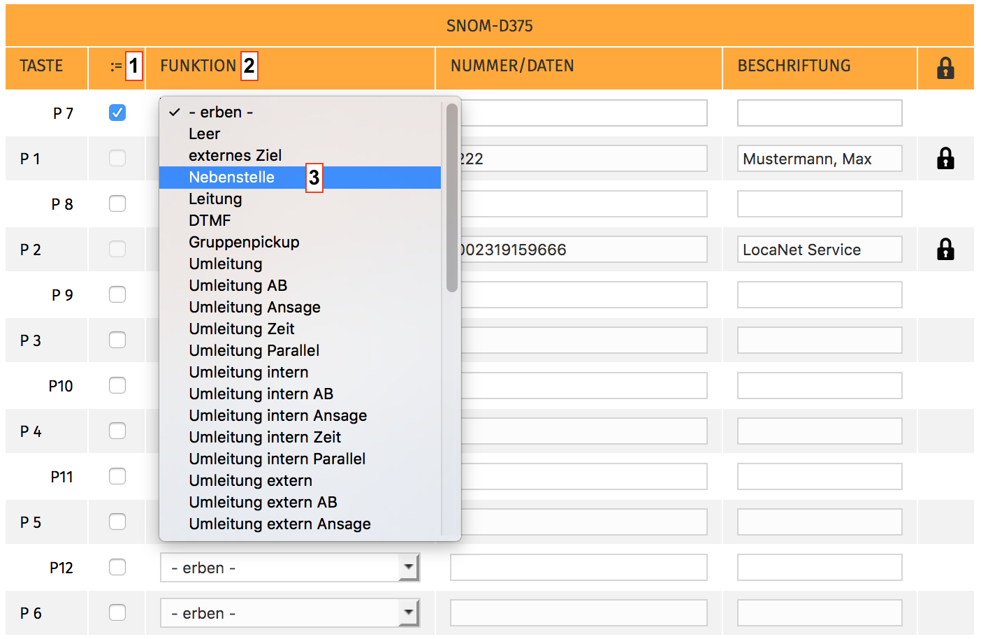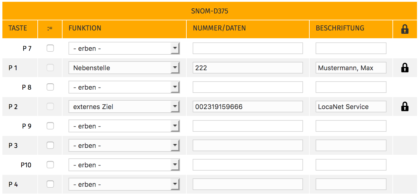 | Taste | Beschreibt die vorhandenen Tasten am Endgerät. Im Beispiel ist P1 die oberste linke Funktionstaste und P7 die oberste rechte Funktionstaste am Endgerät Snom D375. |