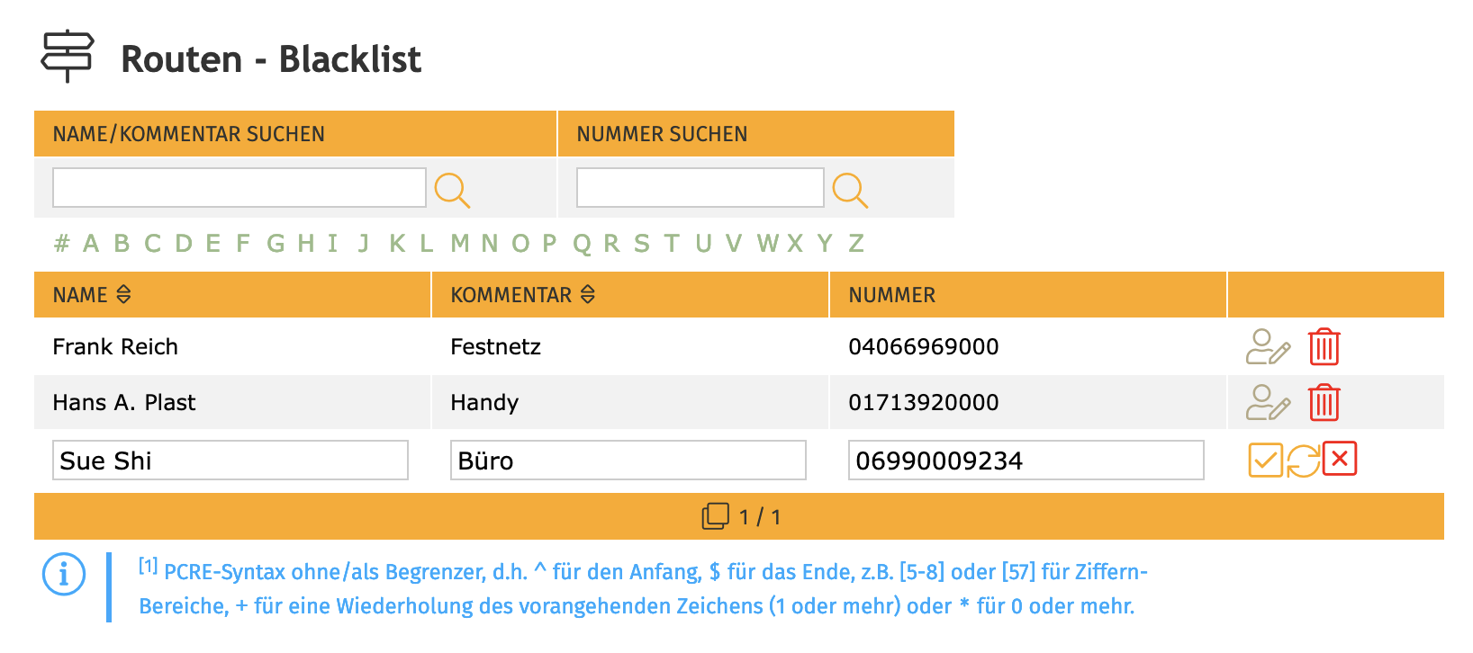 Zu sperrende Rufnummern werden im Format PCRE-Syntax eingetragen.