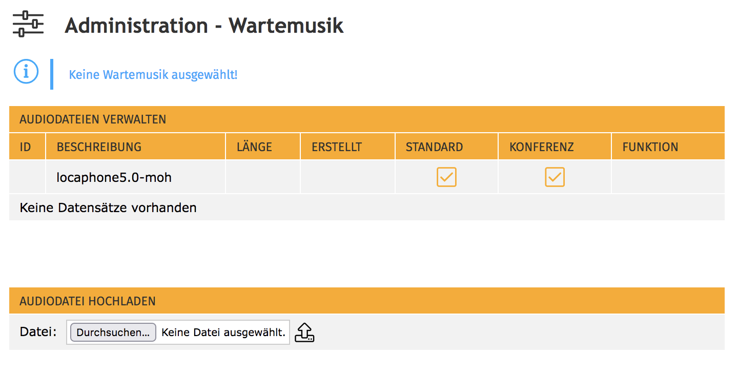 Mit LocaPhone ab Version 5.2.0 erfolgt die Verwaltung von Wartemusik über der Webinterface von LocaPhone. Hier kann man zur Wiedergabe fest eine Musik-Datei zuordnen.