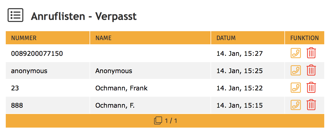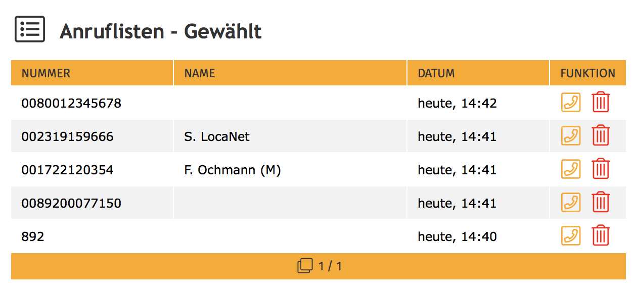 Per Mausklick im Webinterface (oder Menü/Funktionstaste am Endgerät) wird die angezeigte Rufnummer angerufen. Einzelne Einträge können aus der Liste durch den Benutzer entfernt werden. Die komplette Anrufliste kann nur am Endgerät (Menü) gelöscht werden.