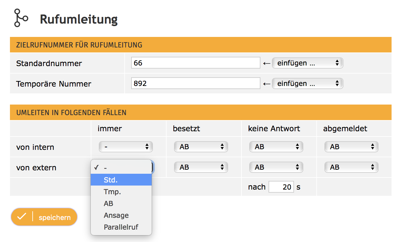 Die Umleitung kann zu einem fest zugeordneten Ziel (Standardnummer - Std.) oder zu einem variablen Ziel (Temporäre Nummer - Tmp.) erfolgen. Diese Nummern können dann in den folgenden Einstellungen verwendet werden.